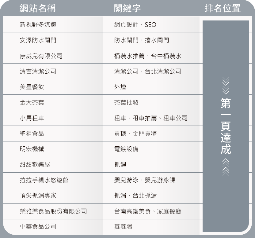 • 10年SEO經驗,已讓許多公司享受關鍵字在第一頁的成效。